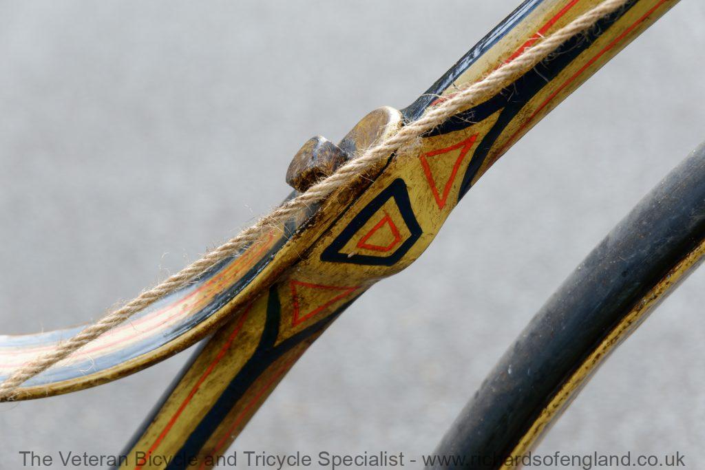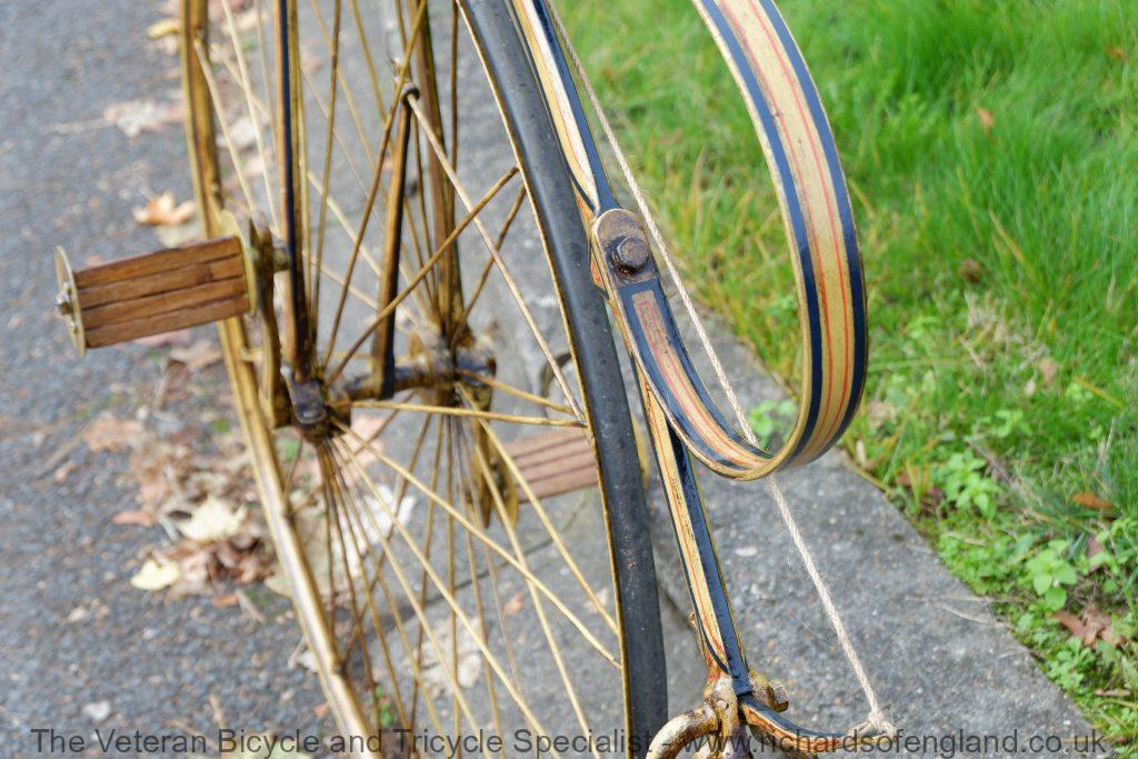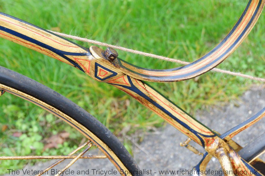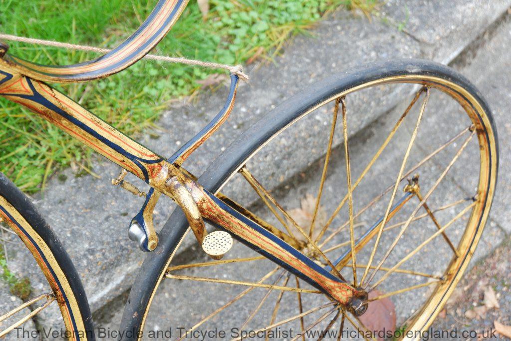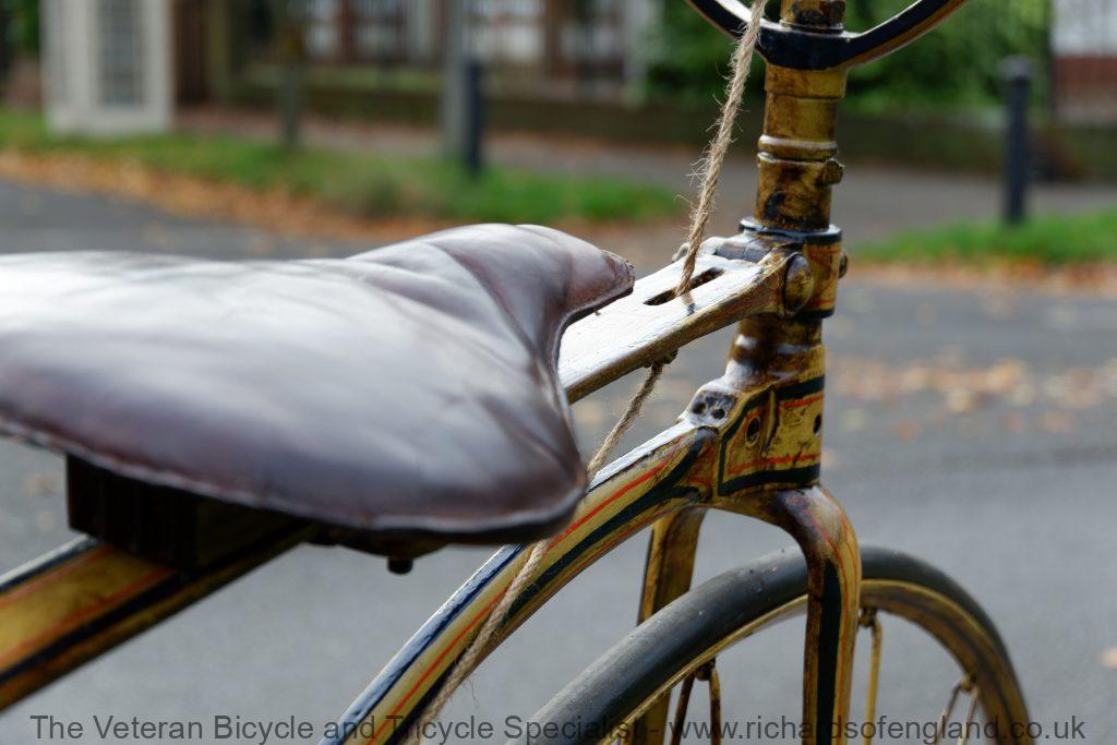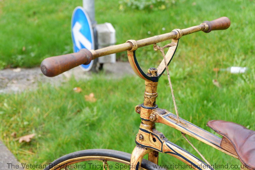 After a bit of archaeology removing layers of paint the remains of this spectacular paint was found documented and carefully repainted bridging the gaps of parts that didn’t survive. It was respoked, new rear wheel fabricated, new handles turned, new pedals, new rear trailing roller brake, step and saddle.