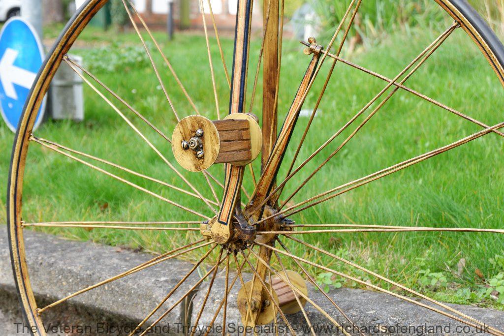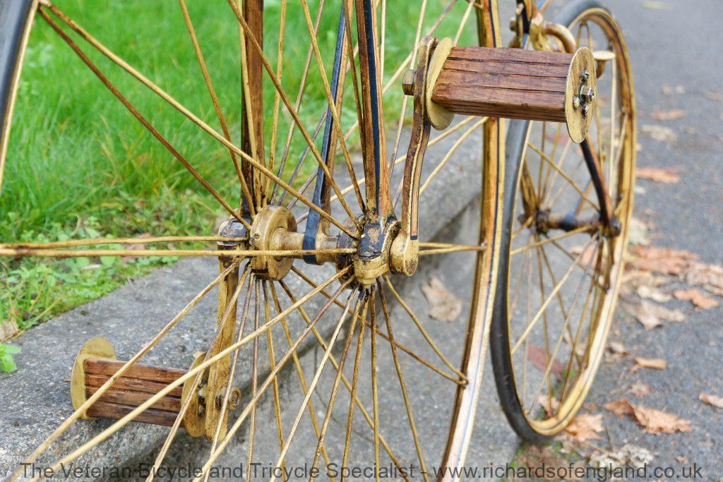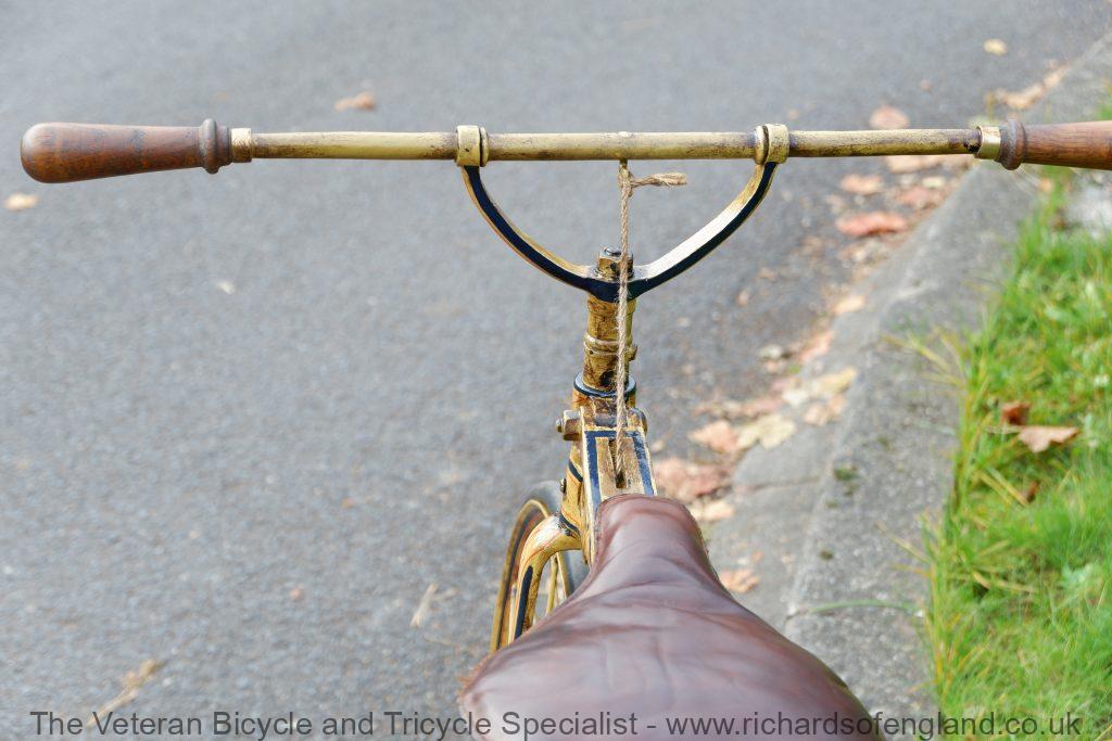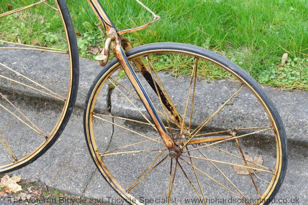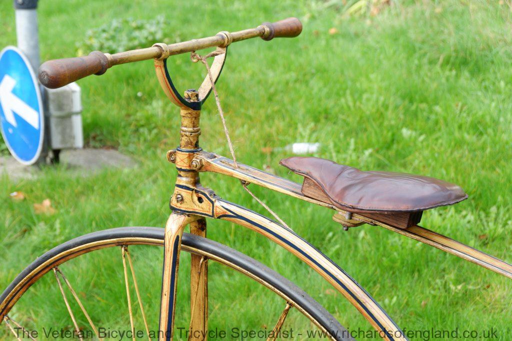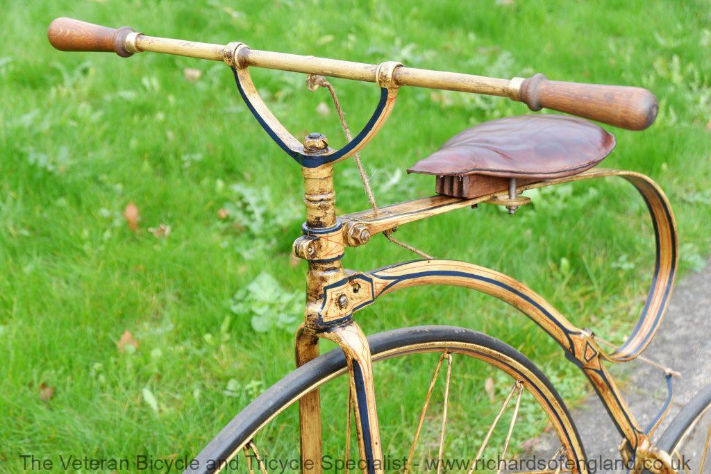 After a bit of archaeology removing layers of paint the remains of this spectacular paint was found documented and carefully repainted bridging the gaps of parts that didn’t survive. It was respoked, new rear wheel fabricated, new handles turned, new pedals, new rear trailing roller brake, step and saddle.