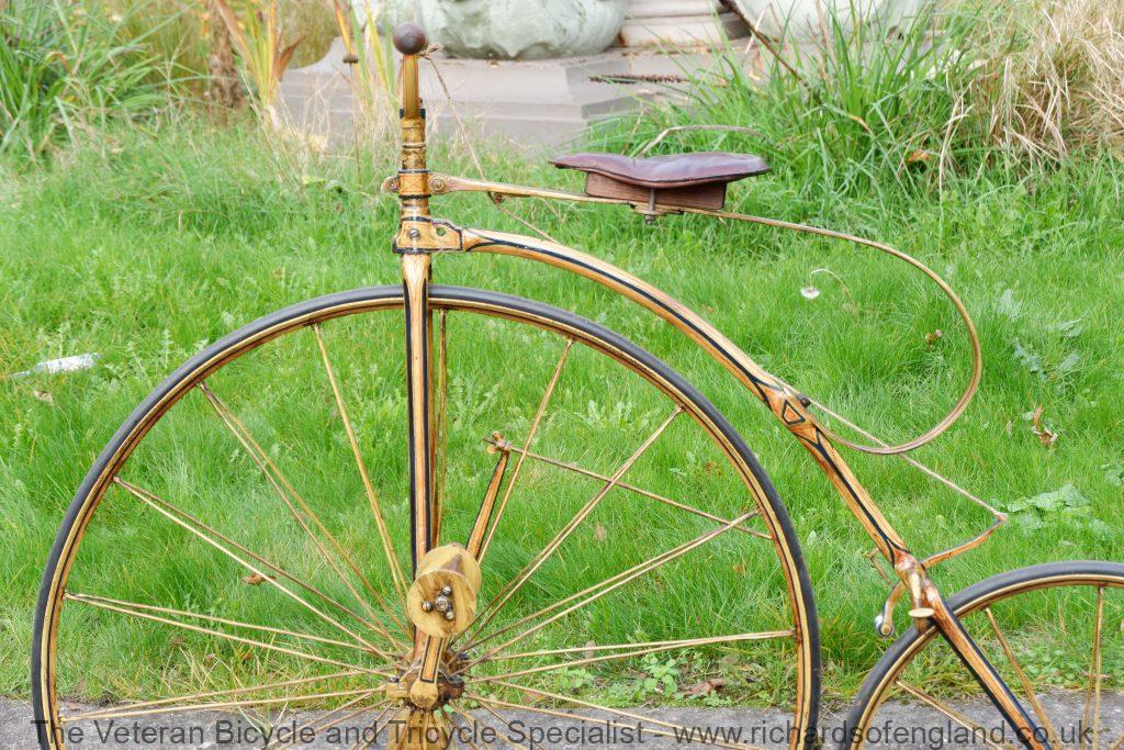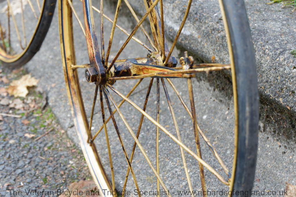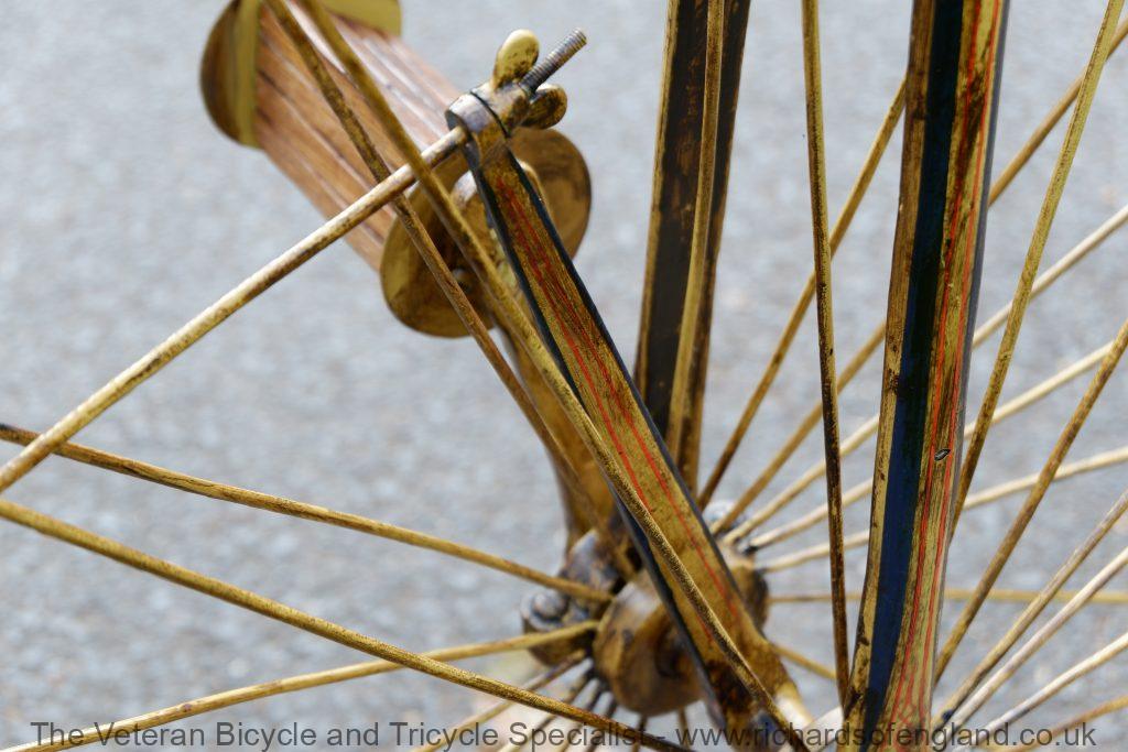 This ordinary bicycle was missing a few parts but it is historically significant so deserved careful restoration. This is a fairly distinctive machine because of the front wheel using the tensioning arm. The tensioning arm and front wheel is Ariel design, but looking at the frame, forks and construction it is very early. This is likely one of the first penny farthing bicycles made by James Starley. When he first started implementing his wheel design he basically used existing velocipedes and converted them into steel wheel penny farthings. He advertised this as The Converted “Ariel” Bicycle, customers could provide their old French velocipedes for an upgrade. The upgrade consisted of steel spoked wheels and special bearings. Custom paint in any colours at no extra charge also included.