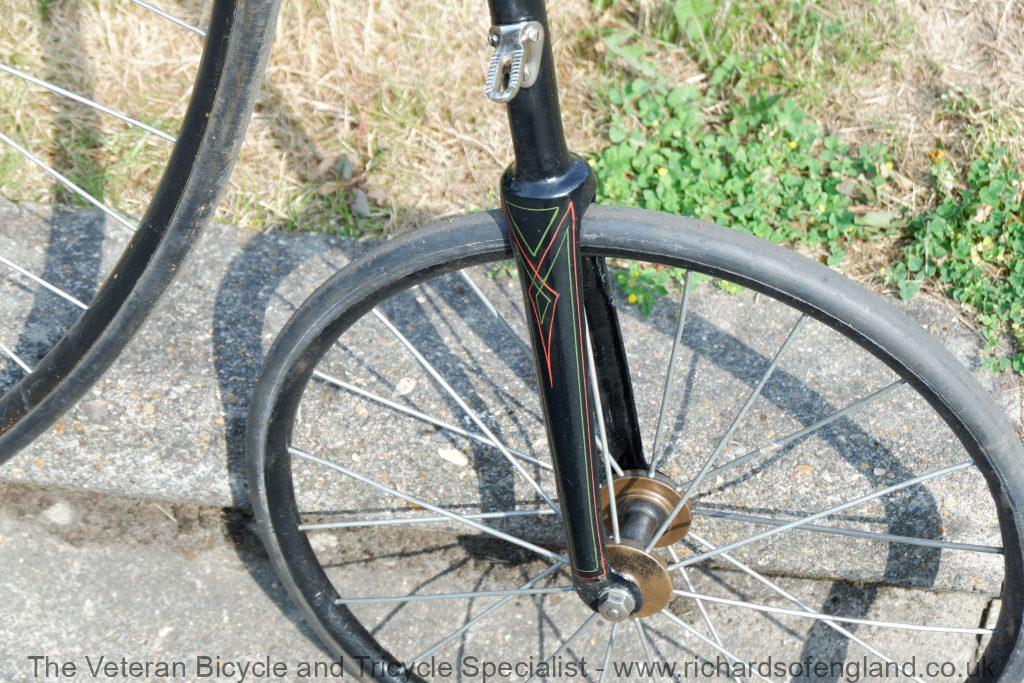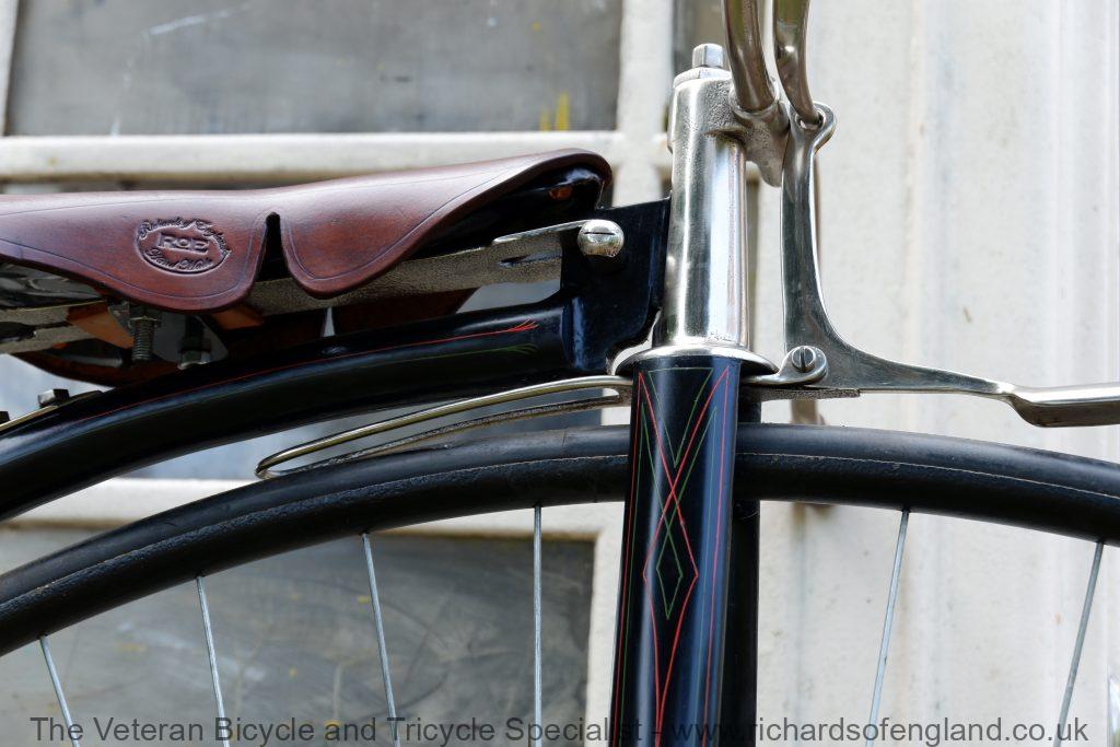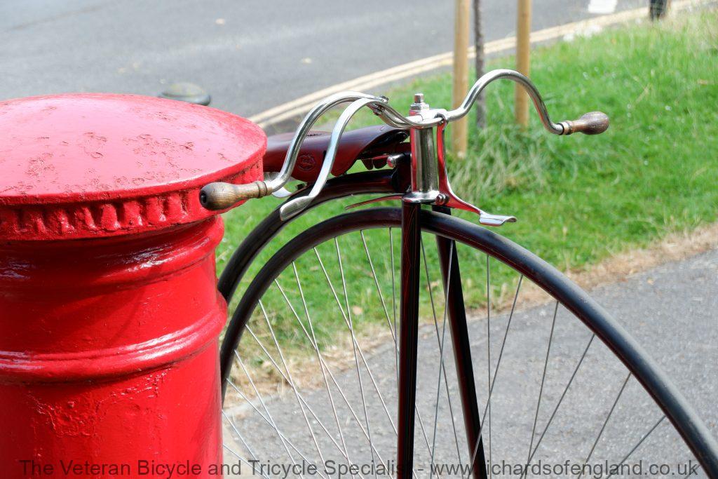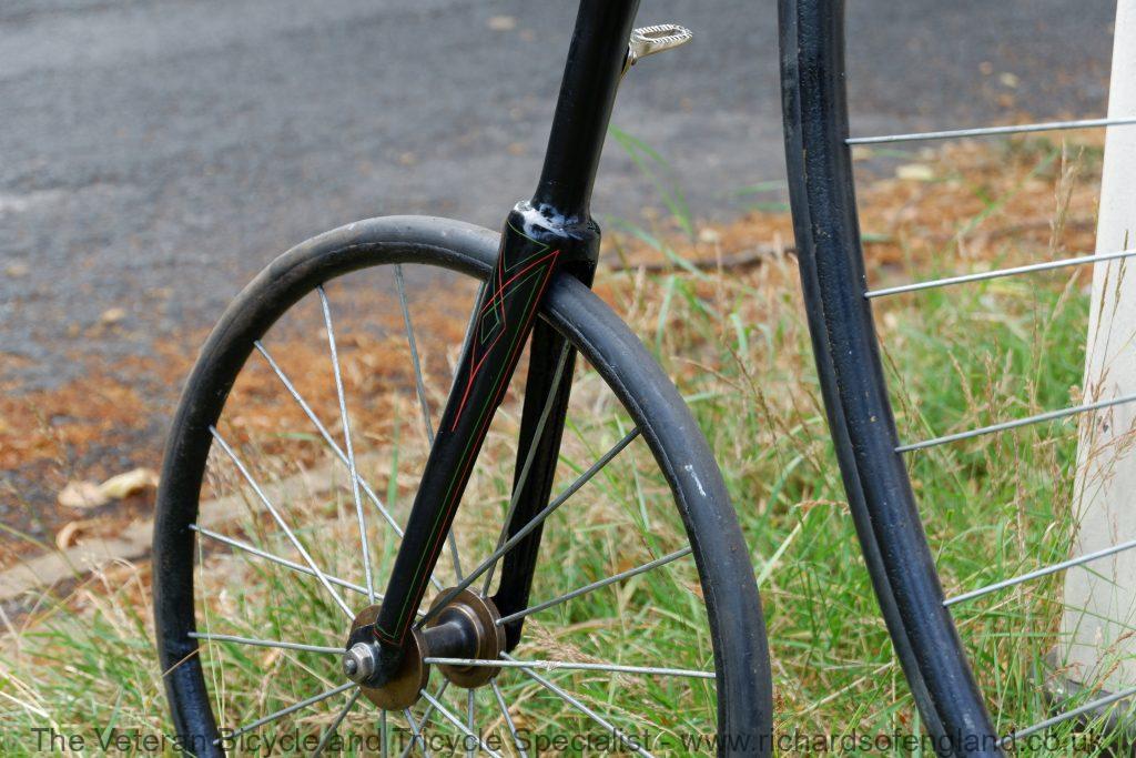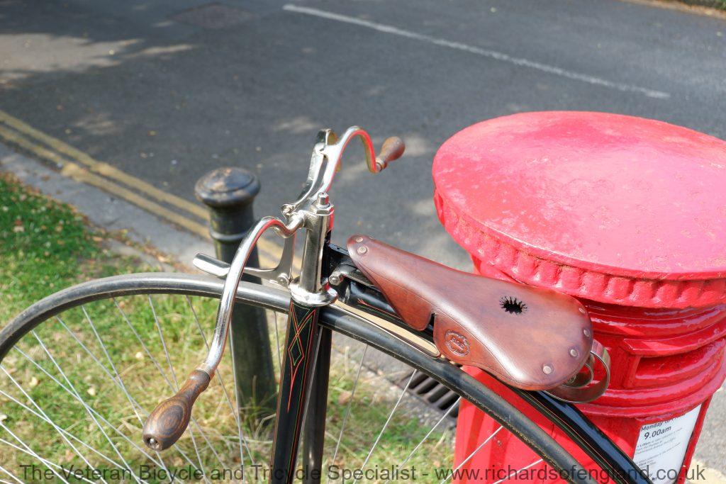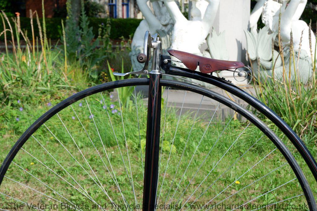 A lot of penny farthings get labelled as a Humber if they have no frame number and have the distinctive scroll saddle spring. The scroll saddle spring was sold as an accessory so could have been fitted to any machine. This machine has Aeolus bearings which again was sold as an accessory and bought in by many smaller makers. For the repair and restoration work it was treated as a Humber as it has an accumulation of features pointing that way.