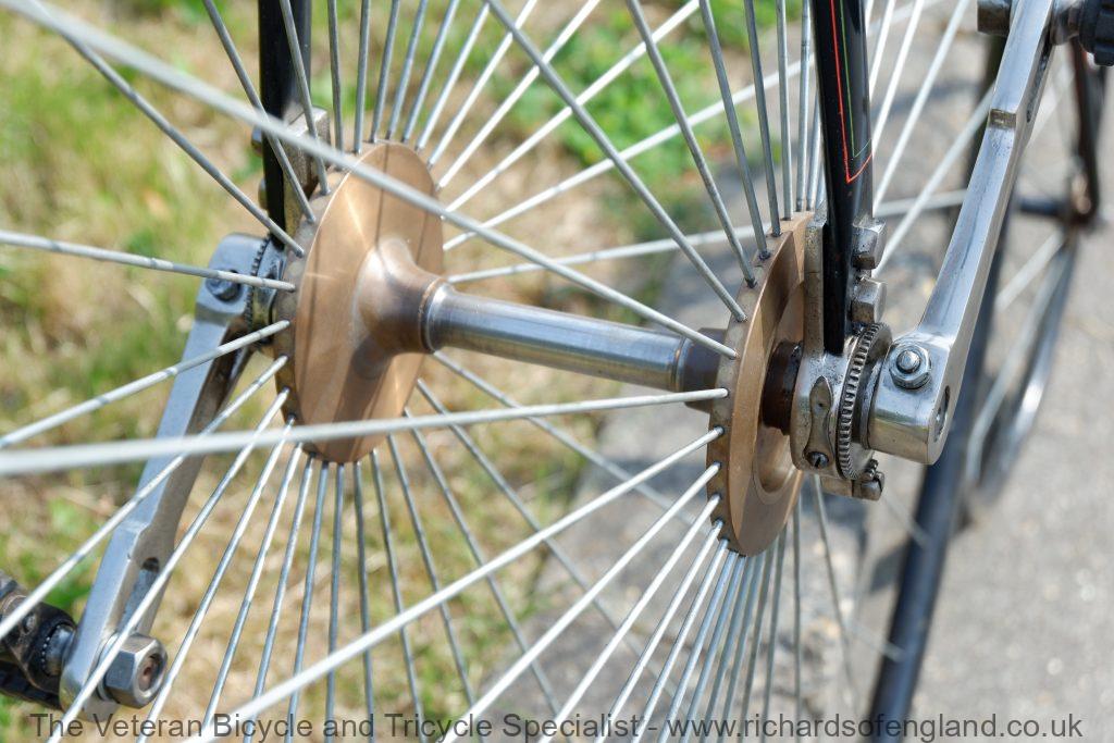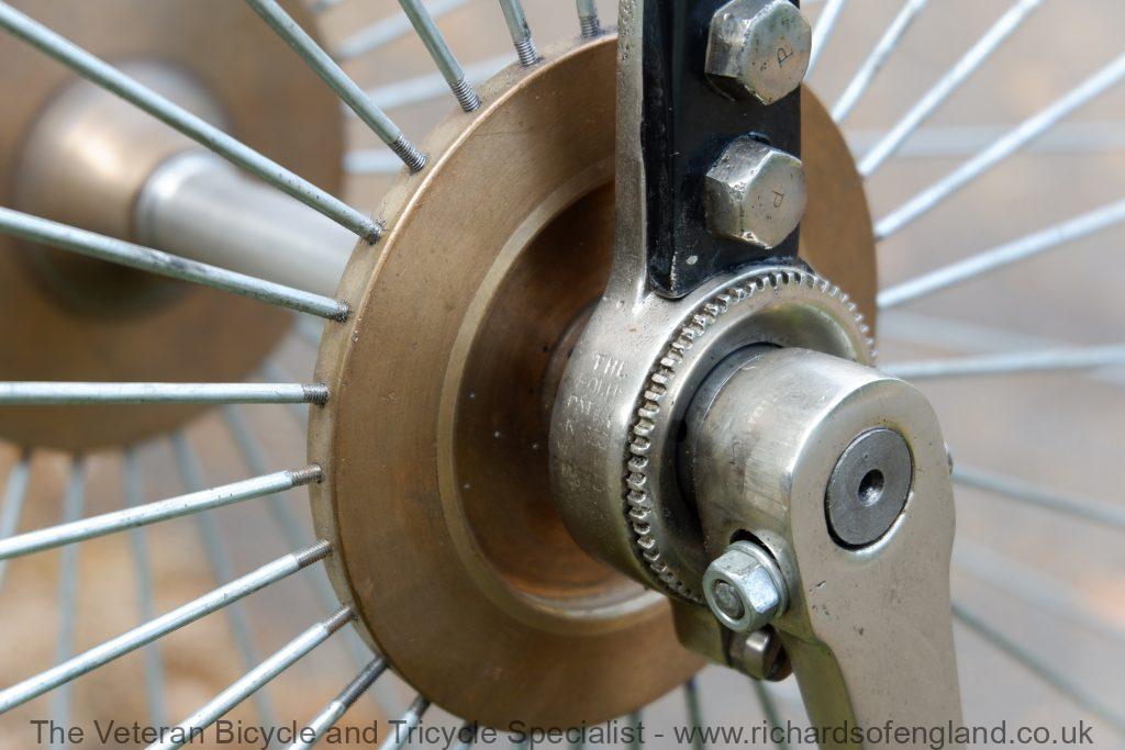This project required repair of both cranks, new mounting step, new screws, new spoon brake fabricating, the Aeolus bearings required welding up and teeth re machining, truing up the big wheel, repainting the backbone and forks, coach lining, polishing the handlebars and nickel plating etc..