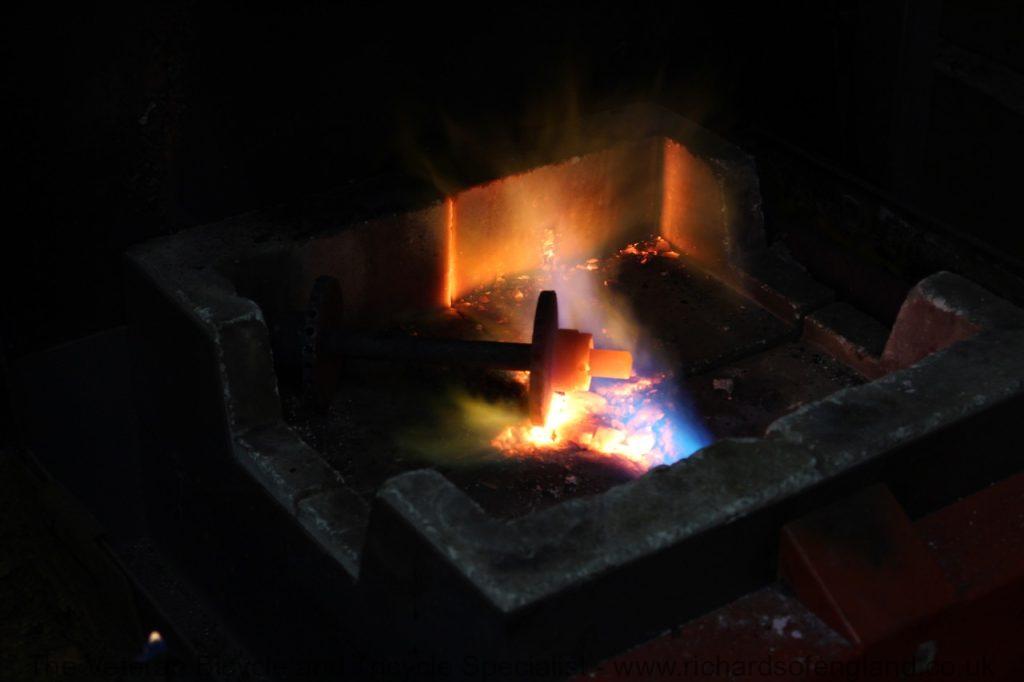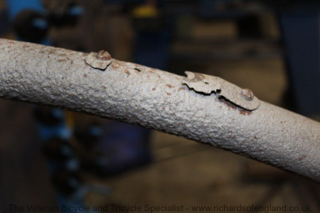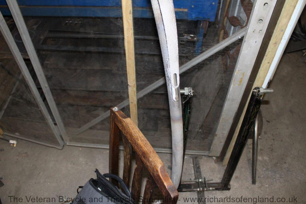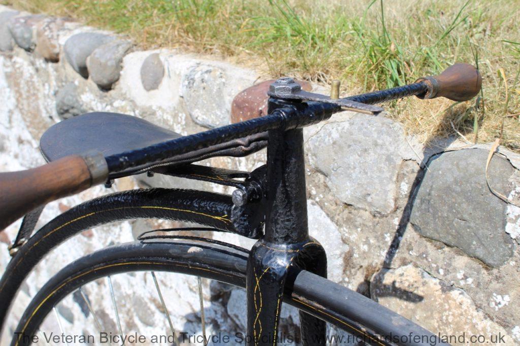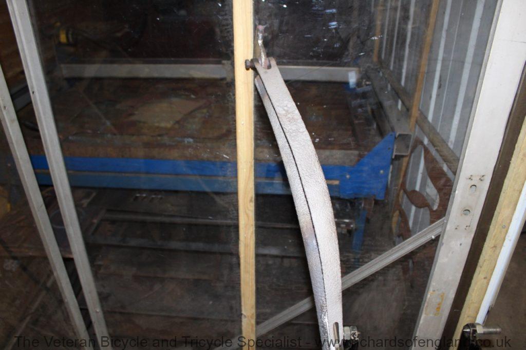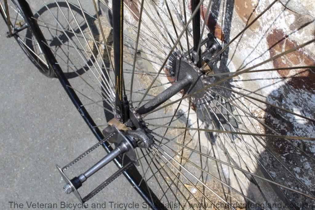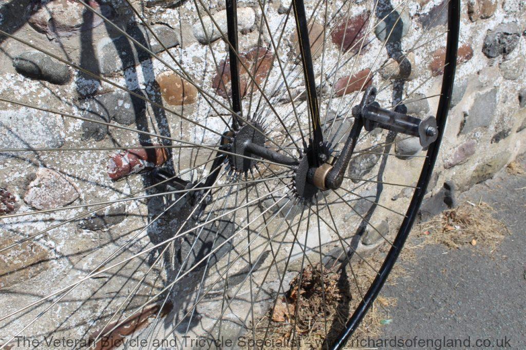 This ordinary bicycle aka penny farthing came to us in a terrible state. Maybe it was dug up or found in a river it was bad, some before pictures at the bottom. Luckily due to its very distinctive bearings it was easily identify the maker. This veteran bicycle was made in Kings Lynn, Norfolk by the maker James Plowright. Based on the handlebars, locknut spokes and method of construction I dated it pre 1879. The bearings are very advanced for an ordinary bicycle that could have been made as early as 1876. They bearings were in a bad way but after machining a new set of rollers they functioned as intended. It needed a lot of corrosion repair on the frame, new wheel rims, pedals, saddle etc.. it’s never going to be mint condition with such extensive rust but the machine is now saved and usable for learning to ride or display.